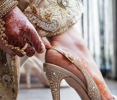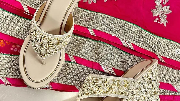 Every bride deserves to feel comfortable and confident on her wedding day, and the right footwear plays a crucial role. Explore our collection of Indian bridal footwear, featuring elegant juttis, mojaris, and sandals crafted from luxurious materials and adorned with intricate embellishments. Find the perfect pair that complements your bridal lehenga or saree and provides the support and comfort you need to celebrate throughout your wedding festivities.(Indian bridal)